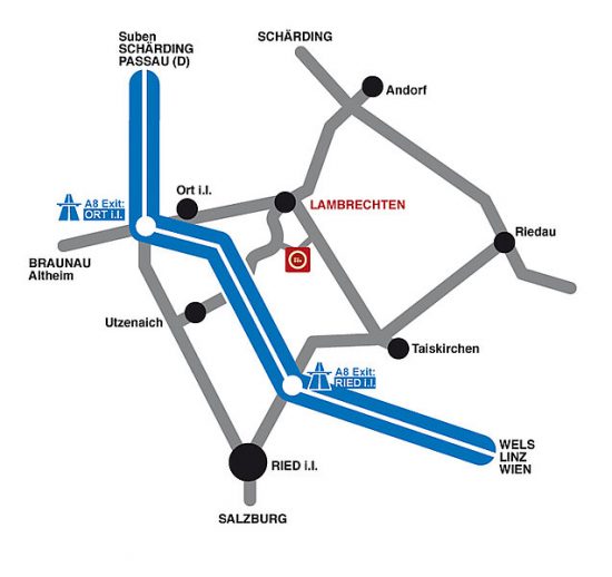 Verlassen Sie die Innkreisautobahn A8 beim Exit „Ried i.I.“ Fahren Sie auf der L513 Richtung Taiskirchen, Riedau. Nach etwa 6 km biegen Sie bei einer Tankstelle links in die Bezirksstraße 1121 in Fahrtrichtung Lambrechten ein. Nach weiteren 6 Kilometern (2 km vor Lambrechten) achten Sie auf den Wegweiser der Tischlerei Huber GmbH am linken Straßenrand. Folgen Sie den Wegweisern noch für ca. 1 Kilometer.